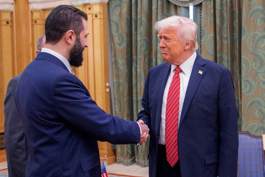 სირიის დროებითი პრეზიდენტი აჰმედ ალ-შარაა ხელს ართმევს პრეზიდენტ დონალდ ტრამპს ერ-რიადში, საუდის არაბეთში, 2025 წლის 14 მაისი. ბანდარ ალჯალუდი/საუდის სამეფო სასახლე AP