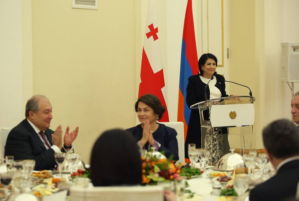 საქართველოს და სომხეთის პრეზიდენტებმა ორი ქვეყნის მეგობრობის სადღეგრძელო შესვეს და აღნიშნეს, რომ სტუმართმოყვარეობასა და მეგობრობას ორივე ქვეყნის ხალხები განსაკუთრებული სითბოთი და პატივისცემით ეპყრობიან, რაც საერთო ღირებულებებზე მიანიშნებს.