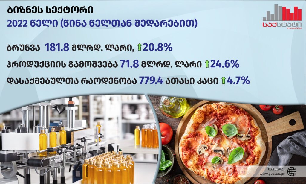 საქართველოში ბიზნეს სექტორის ბრუნვის მოცულობა 2022 წელს 20.8%-ით გაიზარდა და 181.8 მილიარდი ლარი შეადგინა