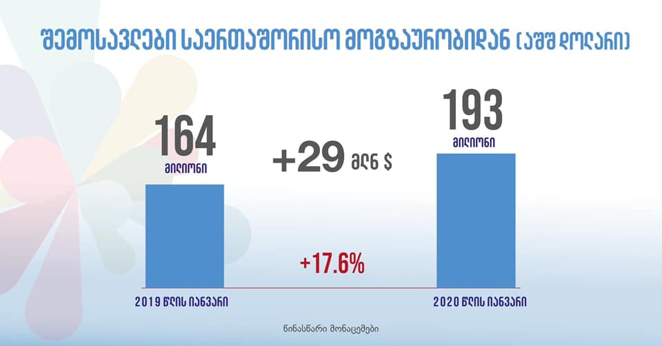 ტურიზმის ეროვნული ადმინისტრაციის წინასწარი მონაცემებით, ქვეყანაში 2020 წლის იანვარში საერთაშორისო მოგზაურობიდან 193 მლნ აშშ დოლარი შემოვიდა, აღნიშნული მაჩვენებელი წინა წლის შესაბამისი პერიოდის მონაცემს, 17.6 პროცენტით, ანუ 29 მილიონი დოლარით აღემატება.