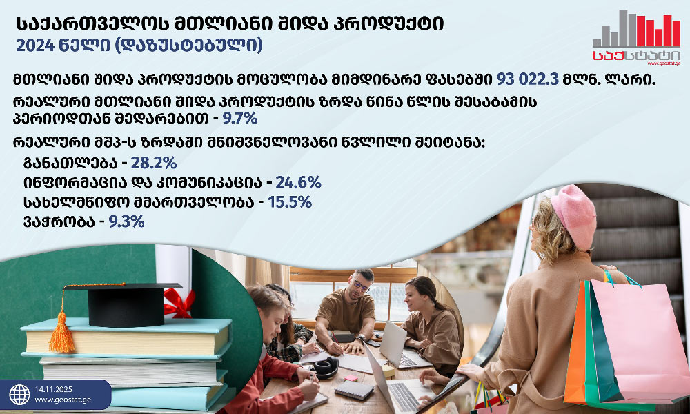 სტატისტიკის ეროვნული სამსახურის დაზუსტებული მონაცემებით, 2024 წელს მთლიანი შიდა პროდუქტის მოცულობა მიმდინარე ფასებში 93 022.3 მლნ. ლარს გაუტოლდა, რაც 15.0 პროცენტით აღემატება წინა წლის შესაბამის მაჩვენებელს.