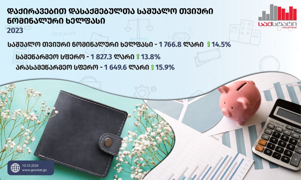 სტატისტიკის ეროვნული სამსახურის მონაცემებით, 2023 წელს საქართველოში დასაქმებულთა საშუალო თვიური ნომინალური ხელფასი გასულ წელთან შედარებით, 14.5 პროცენტით, ანუ 223.8 ლარით გაიზარდა და 1 766.8 ლარი შეადგინა.