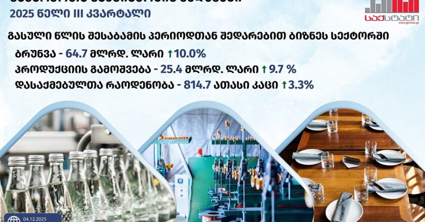 2025 წლის მესამე კვარტალში, საქართველოში ბიზნეს სექტორის ბრუნვის მოცულობა თითქმის 65 მილიარდ ლარამდე გაიზარდა