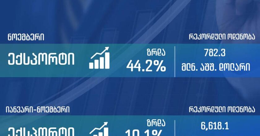 საქართველო ეკონომიკის სამინისტრო: 2025 წლის ნოემბერში ექსპორტი, წინა წელთან შედარებით, 44.2%-ით გაიზარდა და რეკორდული ოდენობა, 782.3 მლნ. აშშ დოლარი შეადგინა December 15, 2025, 2:34 pmDecember 16, 2025